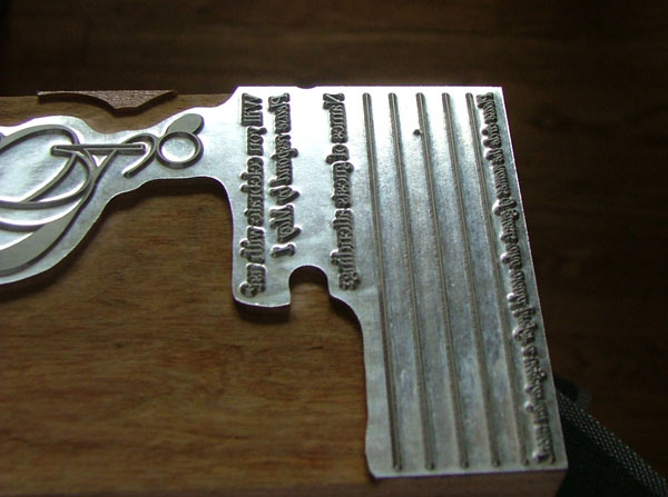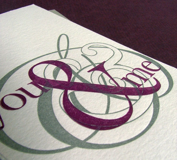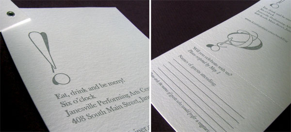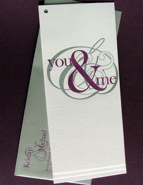 I spent several full days printing—completely filling our house with pieces of cardboard covered in invite pages as we waited for them to dry—and then my mom came down for a weekend of assembly. I kept it pretty simple; just a single grommet in the corner purchased from a local scrapbook shop. I paired the silver and plum printing on Crane’s bright white lettra with metallic silver envelopes that I printed in plum.