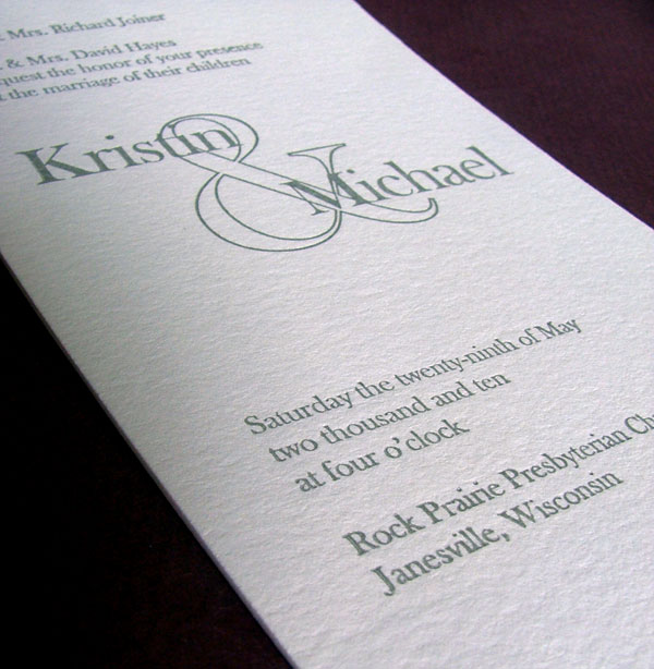 Our day was simple and elegant and so were our invitations. I chose the tall and skinny format suited to a #10 envelope (if they hadn’t been so heavy, they could have been mailed with regular postage!).
