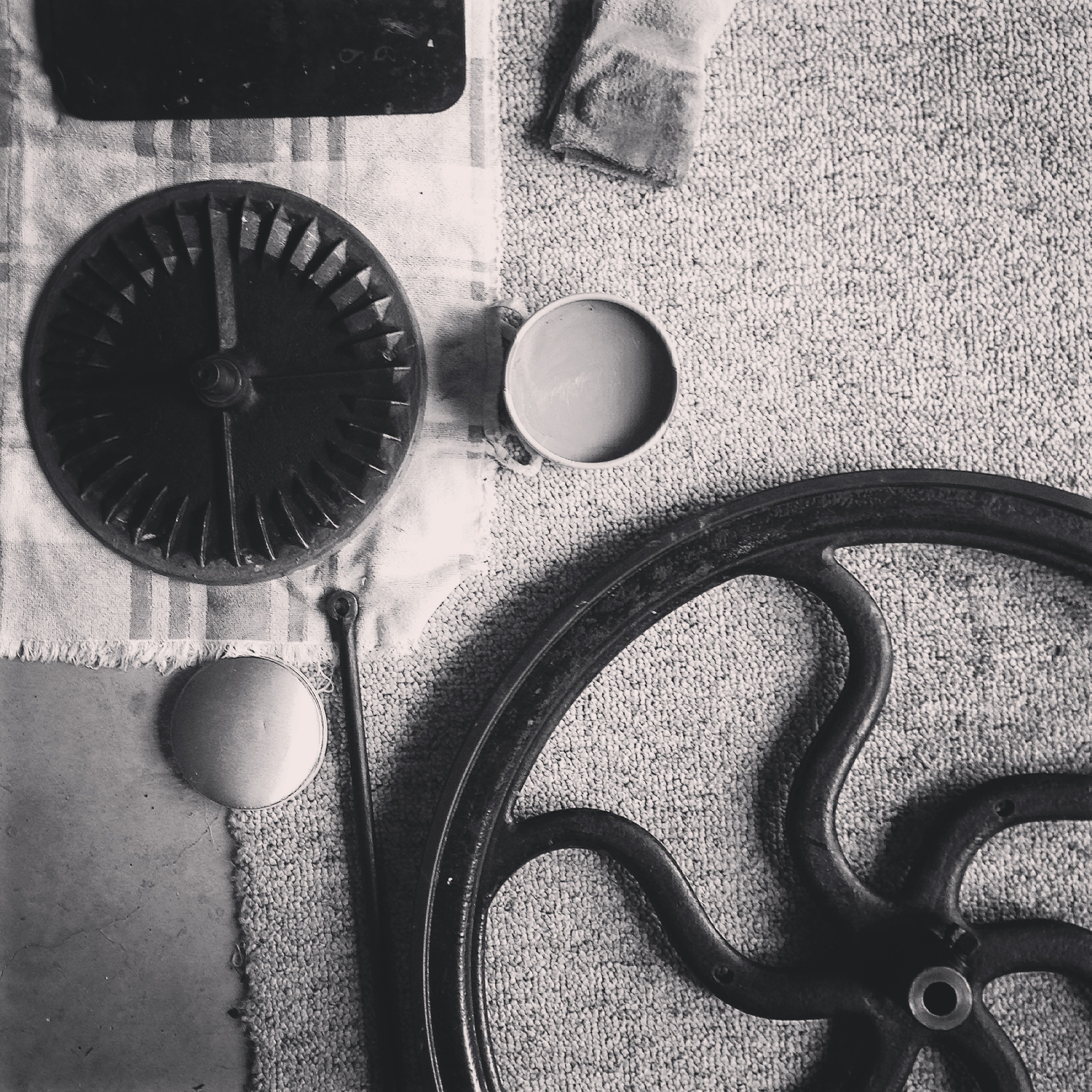 A few weeks before the big move, my dad and I took her apart into two main pieces, the fly wheel and lots of smaller bits, above. I spent a Saturday rubbing wax over every inch of her to protect from any water and humidity—which also had the added benefit of cleaning more of the 100-year-old gunk from her frame than I thought possible. Then we packed her up along with all my studio supplies, securing everything to a pallet and built a wooden crate around it all. We then shipped it to a facility in New Jersey.