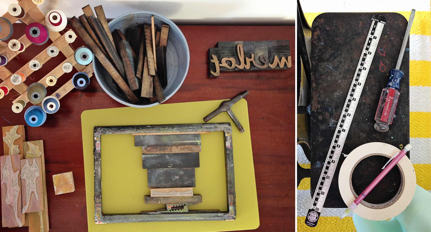 Other necessary printing tools: a ruler, screwdriver, masking tape and pencil hang out on the small side table of my press.