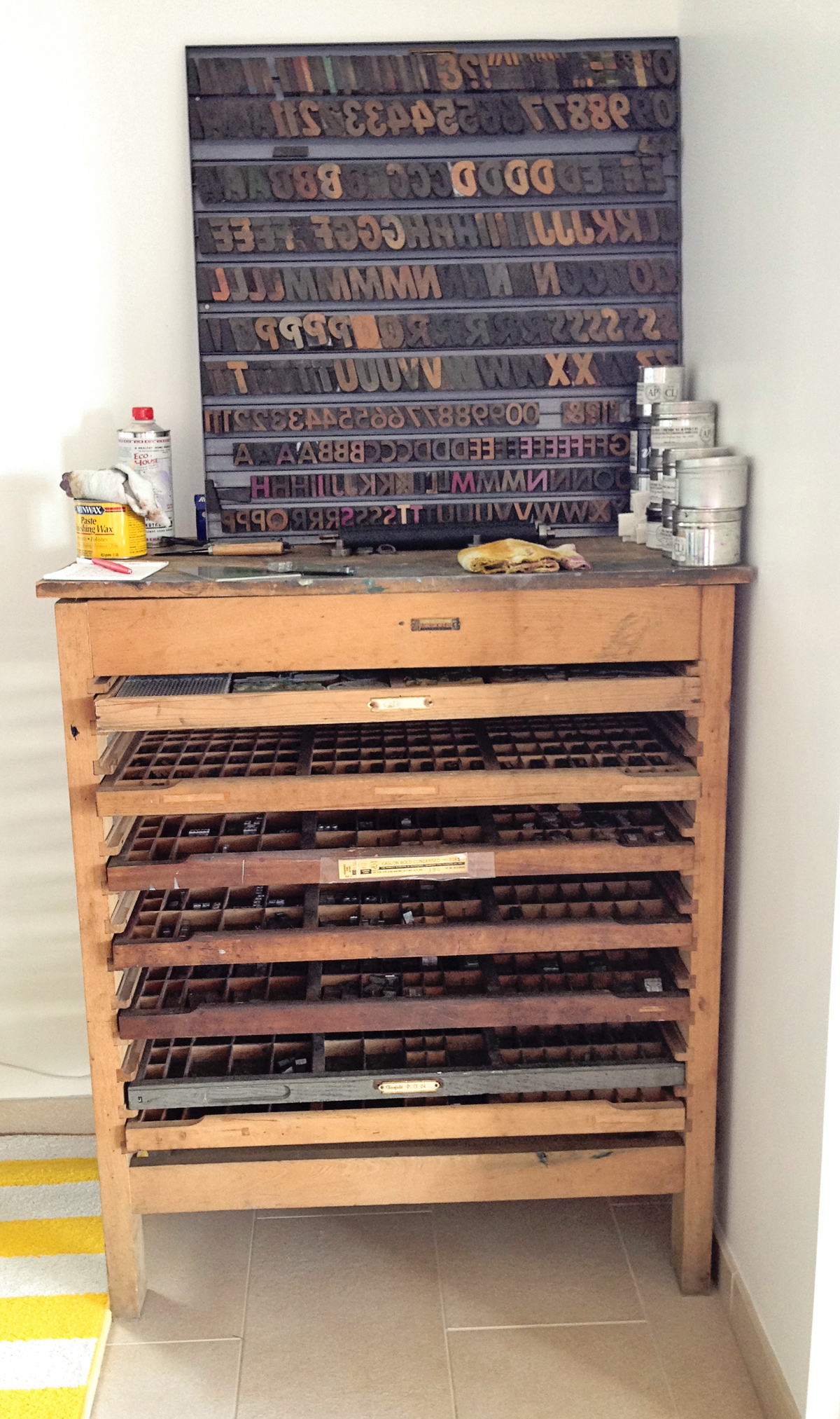 The top of my type cabinet is quite warped (imagine that after a century or so), so I lock up my type on the dresser I use for storage (it belongs to our landlords, so I protect it with a plastic cutting board that just happens to match my yellow rug). I didn’t bring all my furniture (which is the wood blocks used to keep the printing plate or type tight in the frame), so I just keep it in a ceramic bowl I threw in college.