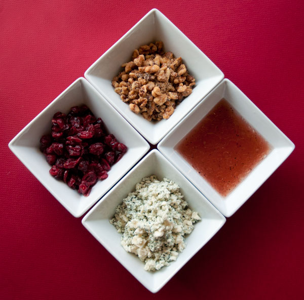 •Mixed greens—go with something more flavorful than Iceburg. I like a mix with frisée and some red or purple leaves, they have a bitterness that works great with the sweet elements in the toppings!