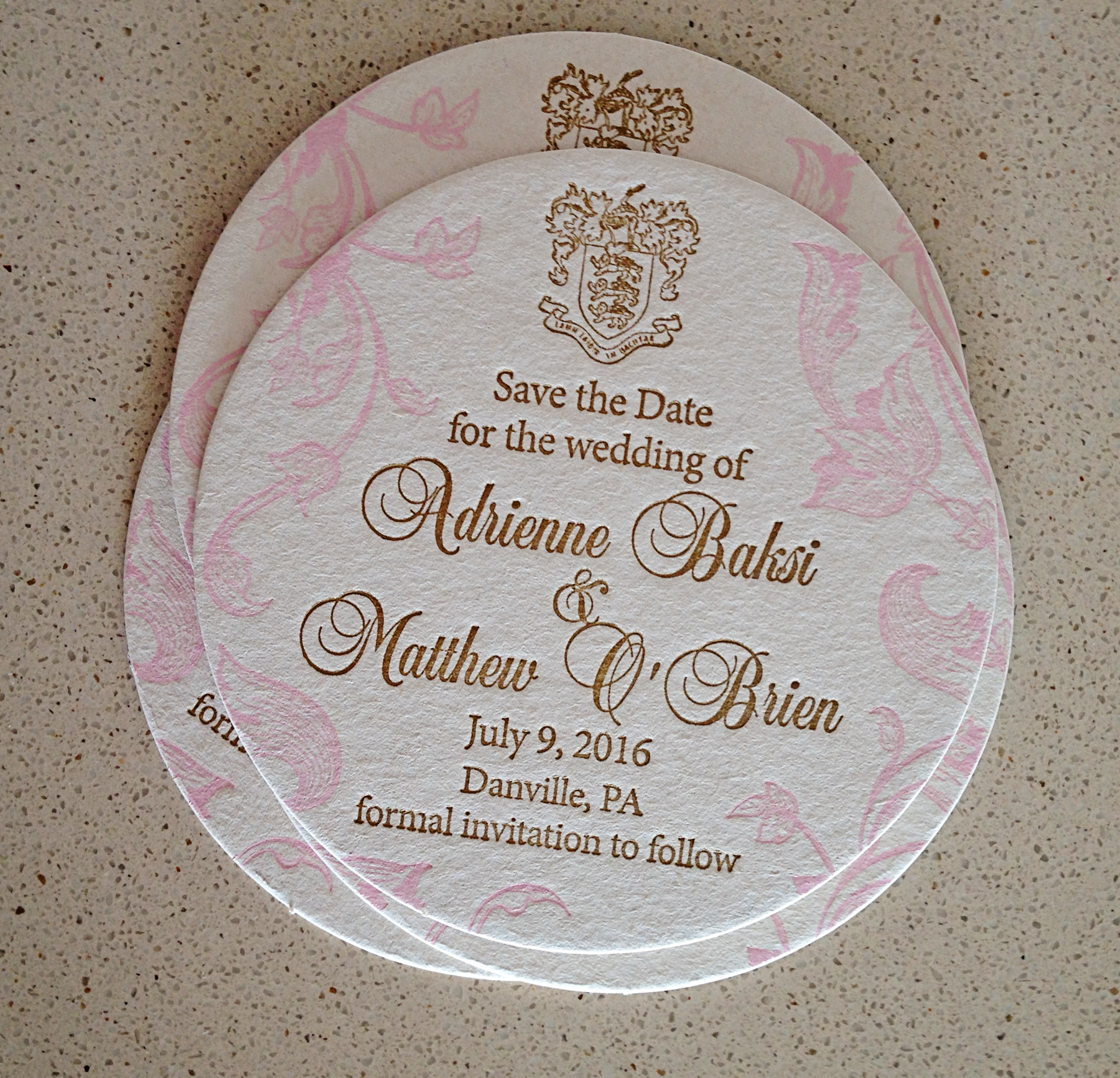 Adrienne wanted the ever-popular coaster save the date, but she wanted the design to reflect her fairly formal wedding. I created a design that employed traditional typefaces and a fancy, yet very legible, script.